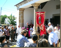Chegada ao Adro da Igreja, mais população concentrada para receber tão ilustre personagem. Após a Missa, procedeu-se à Procissão pelas ruas da aldeia. Existiam peças ornamentais nas janelas, arcos bem ornamentados sobre as ruas e simultaneamente eram lançadas pétalas sobre as pessoas. Finda a procissão, seguiu-se uma visita de Sua Reverência aos monumentos da aldeia, nomeadamente, capelas da Srª da Santa Cruz, Srª do Carmo, Srª das Candeias, Santo Amaro. Visitou ainda com alguma mágoa a Fonte Vila.